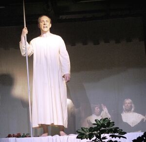 Das üppige Mahl ist im vollen Gang, aber düstere Vorahnungen quälen Jedermann. Für einen Moment scheint ihm, als wäre die ganze Gesellschaft in Totenhemden gekleidet und dumpfe Glocken vermeint er zu vernehmen. Die Buhlschaft sucht ihm die trüben Gedanken an den Tod zu verscheuchen, als er plötzlich seinen Namen rufen hört. Der Tod erscheint und kündigt ihm sein nahendes Ende an. Erschüttert und geängstigt fleht ihn Jedermann an, sich einen Begleiter für seine letzte Reise erwählen zu dürfen. Der Tod gewährt ihm dazu eine letzte Frist, doch selbst sein guter Gesell, sonst in jeder Hinsicht dienstbeflissen, mag diesen Weg nicht mit ihm gehen. Auch alle vermeintlichen Freunde, die Vettern und Bedienstete verweigern ihm die Gefolgschaft. Zuletzt will Jedermann sich noch an seine Schätze klammern, doch Mammon verweigert ihm höhnend den Dienst.